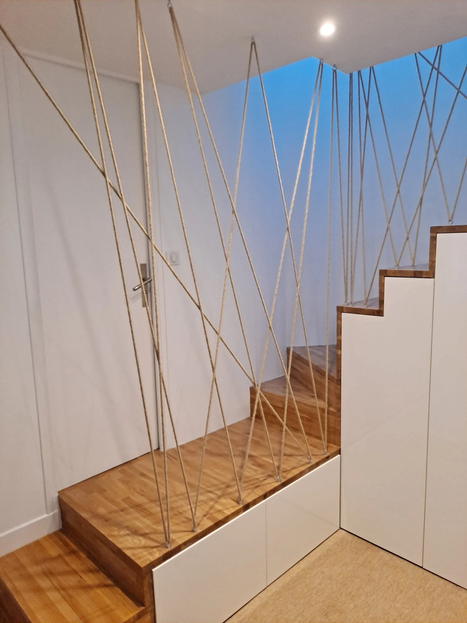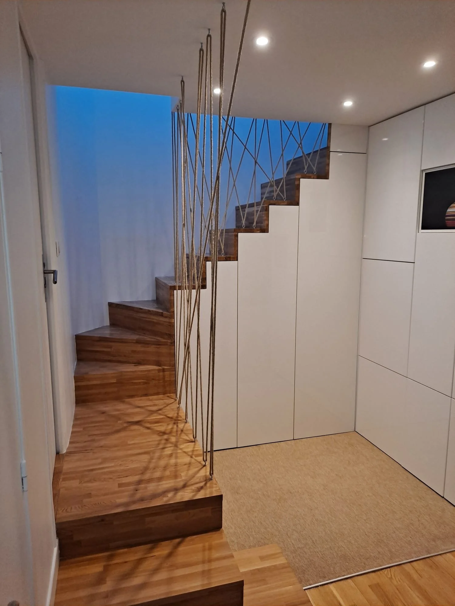 Collaboration avec l'architecte Jesús Lorenzo pour concevoir un escalier moderne et fonctionnel qui respecte les normes de sécurité.